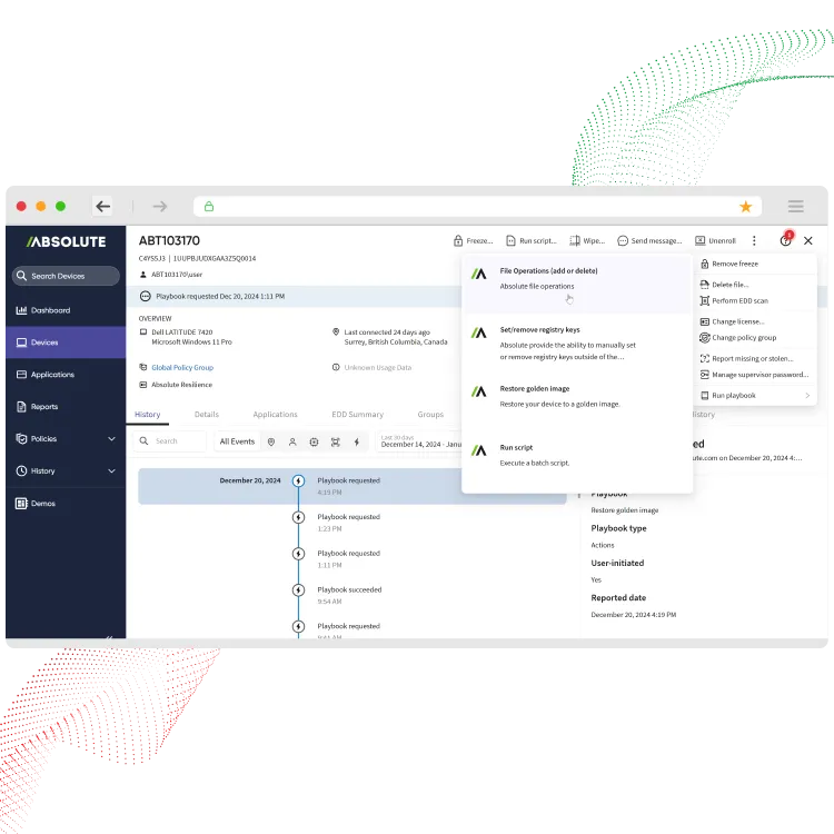 When widespread BSOD, IT or cyber incidents strike, Absolute Rehydrate gives IT teams a fast, automated path to restore devices. Using cloud-based playbooks, Rehydrate restores affected devices back to a trusted state without requiring physical access. This ensures workers are back online in minutes, not days, while security and compliance controls stay intact.