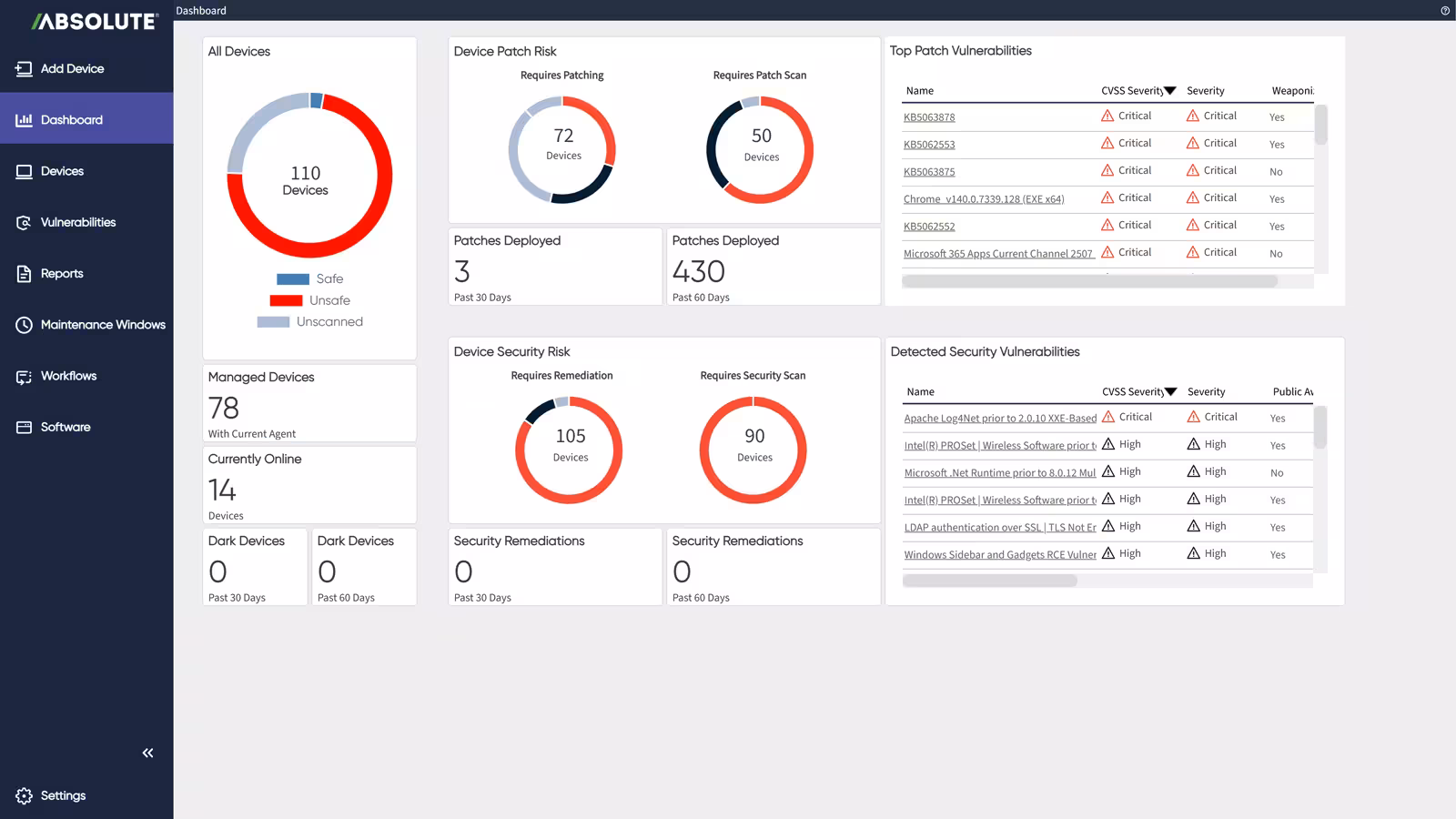 Absolute Resilience for Security is the fourth product edition in the Absolute Secure Endpoint product portfolio. It combines all the capabilities of Absolute Visibility™, Absolute Control™ and Absolute Resilience™ with the Patch module, enabling IT and security teams to scan their endpoint population to assess patch health in relation to known operating system and software vulnerabilities.