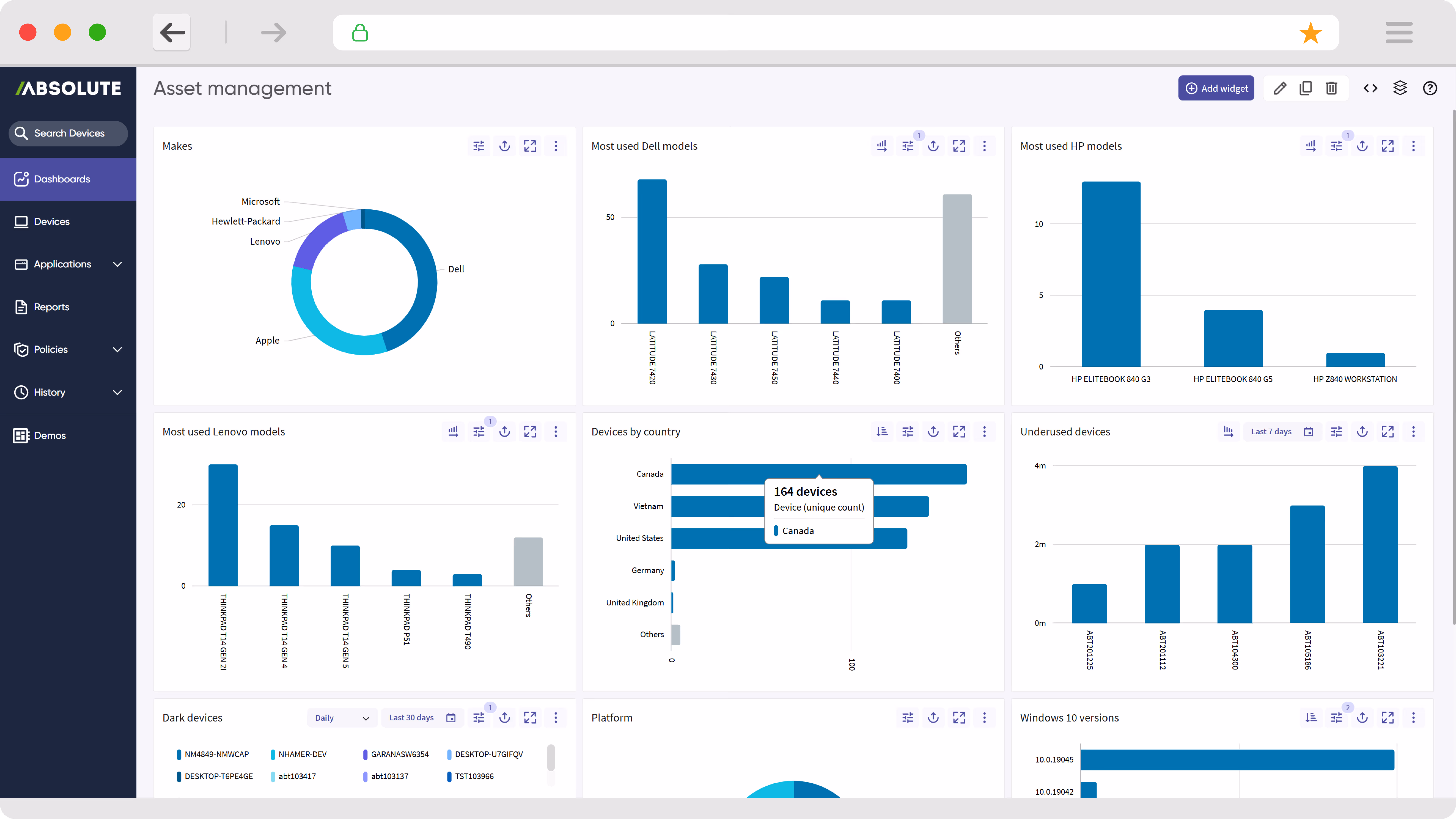 - Inventory your hardware and software assets automatically — then generate reports on hardware status, software, OS, geolocation, and hundreds of other data points that Absolute collects for you.