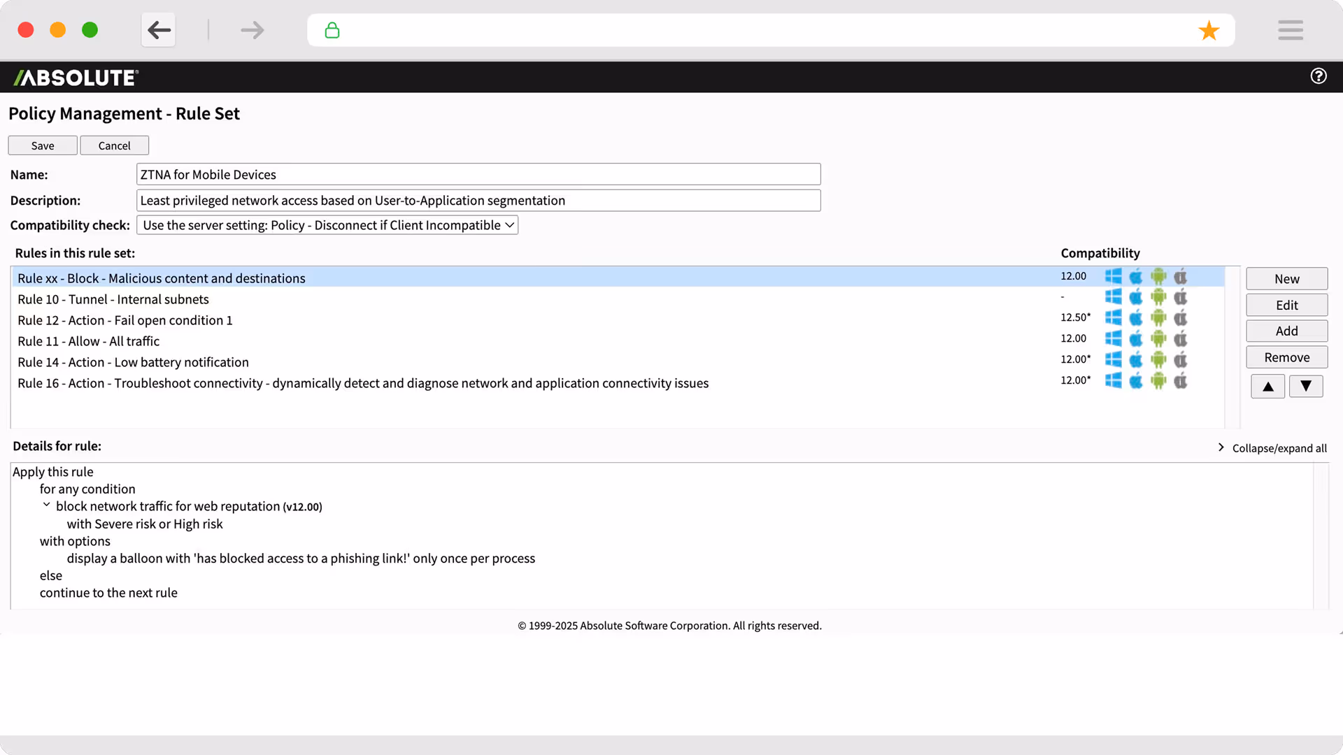 - A transição de instalações locais para a nuvem não acontece da noite para o dia. Nem a adoção completa de Zero Trust. A Absolute é o único fornecedor que oferece um túnel seguro otimizado de classe mundial e uma solução ZTNA como parte de sua plataforma, permitindo uma adoção de ZTNA rápida ou gradual.