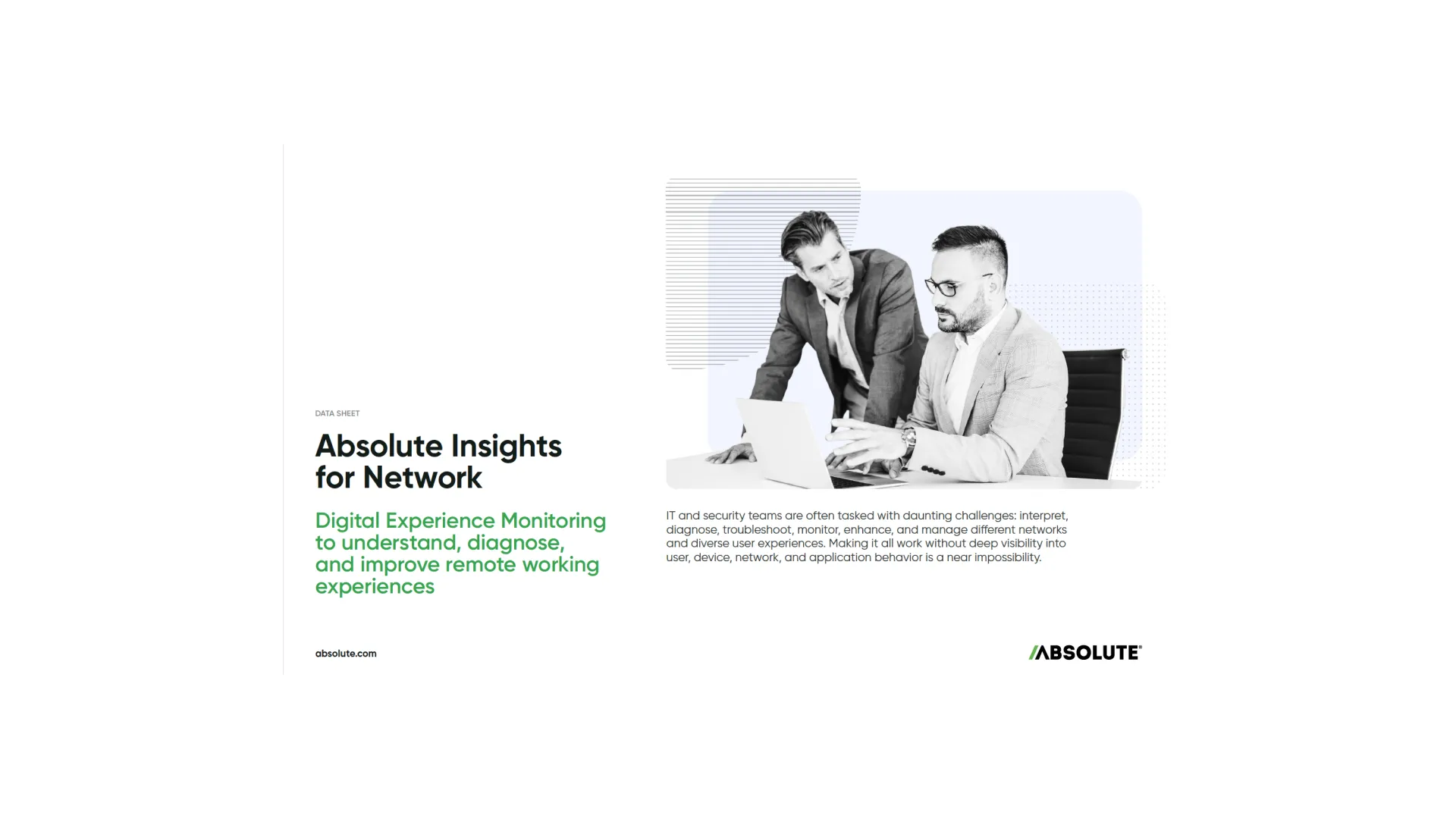 Improve remote work productivity with Absolute Insights for Network. Gain real-time visibility, troubleshoot issues, and strengthen security across Wi-Fi, cellular, and private networks.