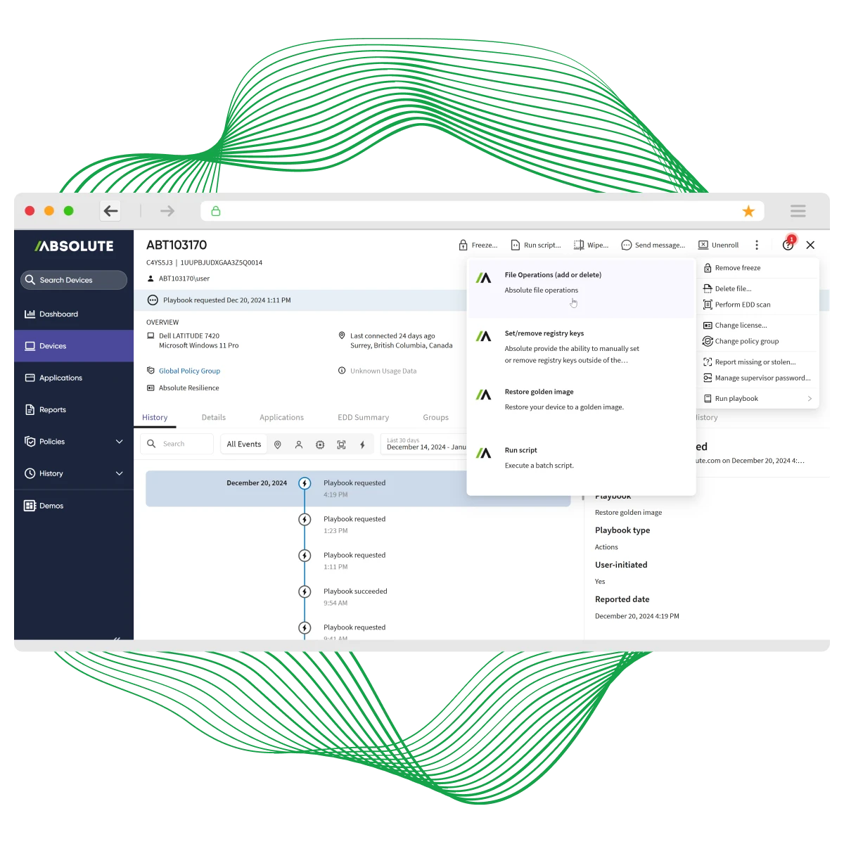 - Rapid, Remote Recovery: Restore OS, apps, and security controls with Absolute Rehydrate—minimizing downtime and eliminating costly desk visits or shipping.
