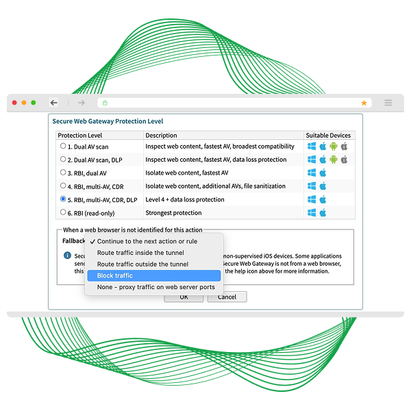 - Easily tailor policies to reduce risk of data exposure and stop access to risky sites without impacting user productivity.